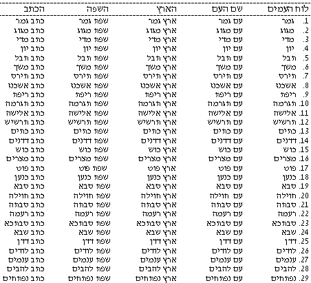לדוגמא: אם X הוא "גמר", השם הראשון ב"לוח העמים", הרי נקבל עבורו את הביטויים: "עם גמר", "ארץ גמר", "שפת גמר" ו"כתב גמר". כך נעשה עבור כל שם מ"לוח העמים", ונקבל את טבלה 1.