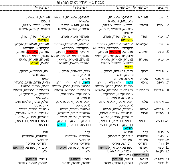 1. מחקתי את כל המלים שאינם בבחינת זיהוי של עמים או של ארצות (דהיינו, אלו המסומנים בכחול).