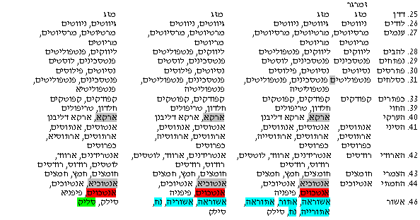 ברשימה זו נפלו טעויות מסוגים שונים, וסומנו בצבעים: