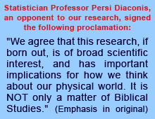 This website has been established by friends and supporters of Doron Witztum's research into the hidden codes in Genesis in order to provide a forum for him to present his work and to answer some of the questions and criticisms which have arisen over the years. There are a great number of misconceptions which have been perpetuated about this research, and the general public is unaware as to what is fact and what is fiction.